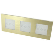Gold Brushed Aluminium Frame LED On/Off Touch Light Switches: These switches can turn the lights on/off and are operated by Touch. These switches are LED compatible as well as all Halogen bulbs and fittings. In addition, the Switch has a blue backlight for each Gang, making it visible in the dark making it easier to find your switch at night.