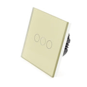 Gold Glass Panel LED On/Off Touch Light Switches: These switches can turn the lights on/off and are operated by Touch. These switches are LED compatible as well as all Halogen bulbs and fittings. In addition, the Switch has a blue backlight for each Gang, making it visible in the dark making it easier to find your switch at night.
