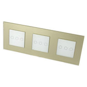 Gold Glass Frame LED Dimmer Touch Light Switches: These switches can turn the lights on/off and are operated by Touch. These switches are LED compatible as well as all Halogen bulbs and fittings. In addition, the Switch has a blue backlight for each Gang, making it visible in the dark making it easier to find your switch at night.